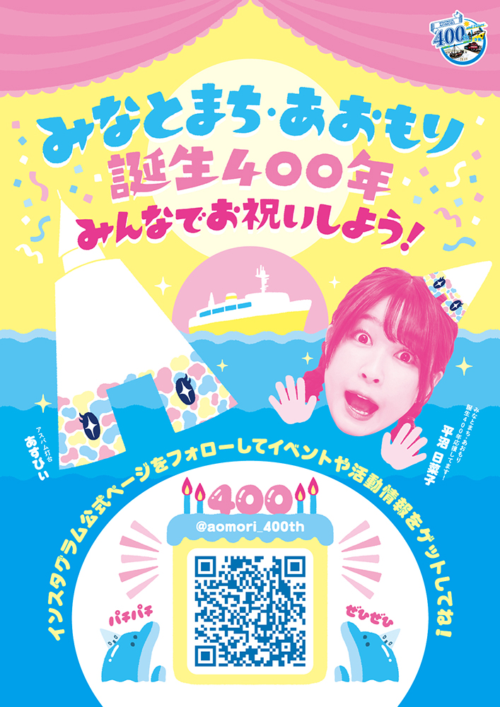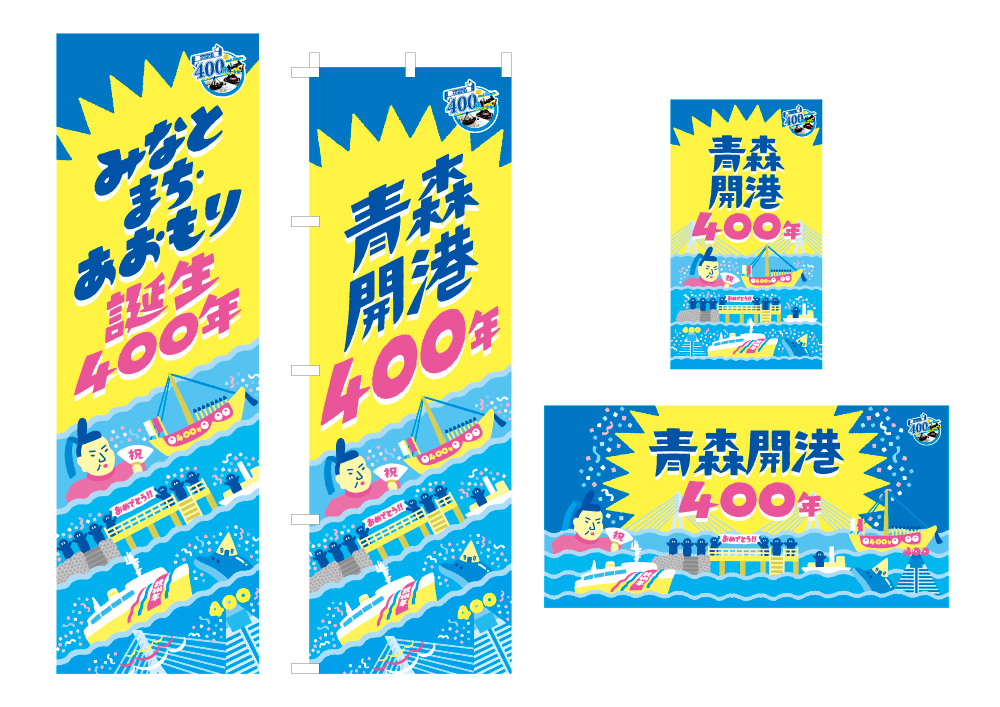 わたくしは今年度の青森開港400年事業にまつわるポスターやのぼり、フラッグなどの各種デザインを制作させていただきました。